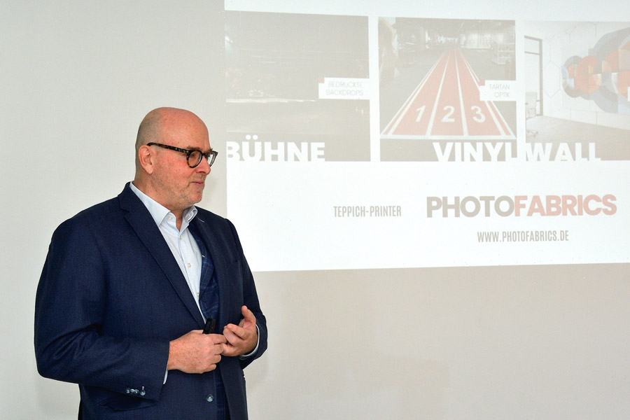 Peter Sapper, BDS-Mitglied und Gründer von Photofabrics, eröffnete die Veranstaltung mit einer faszinierenden Vorstellung seines Unternehmens. Photofabrics bietet innovative Lösungen im Bereich Stoffdruck, Teppichdruck, Matten und Werbetechnik an, die sowohl im privaten als auch im gewerblichen Bereich Anwendung finden. Mit der Großformat Digitaldruckerei setzt Photofabrics Maßstäbe in der Branche. Nicht wenige Stars & Sternchen sind schon über einen Red Carpet made by Photofabrics gelaufen.