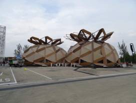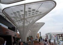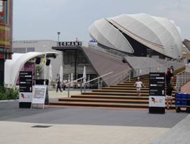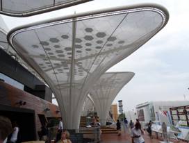 Im Gegensatz zu manchen Pavillonbauten ist man beim deutschen behutsam mit den verwendeten Baustoffen umgegangen, hat natürliche Lammellenlüftungen eingebaut und viel Holz verwendet. Das zentrale Gestaltungs-element sind expressive Membrandächer, die sowohl Schatten spenden als auch Energie erzeugen, dank Integration der erstmals eingesetzten wegweisenden organischen Photovoltaik-Technologie in den Solar Trees.