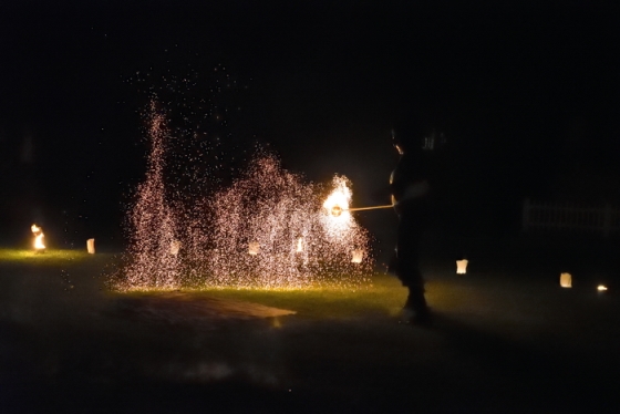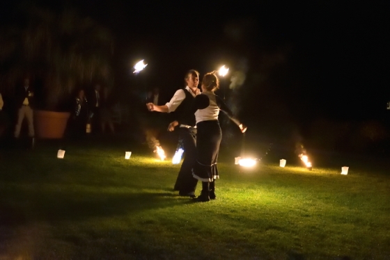 Nach dem Dessert versetzten die „Feuerwelten“ die Gäste mit einer sehr eindrucksvollen Feuershow im Freien in großes Entzücken, ohne dass es einer klimaschädlichen Pyrotechnik bedurft hätte. Die Vorstellung der „Feuerwelten“ war mehr als zirkusreif und rundet die überaus gelungene Geburtstagsfeier ab.