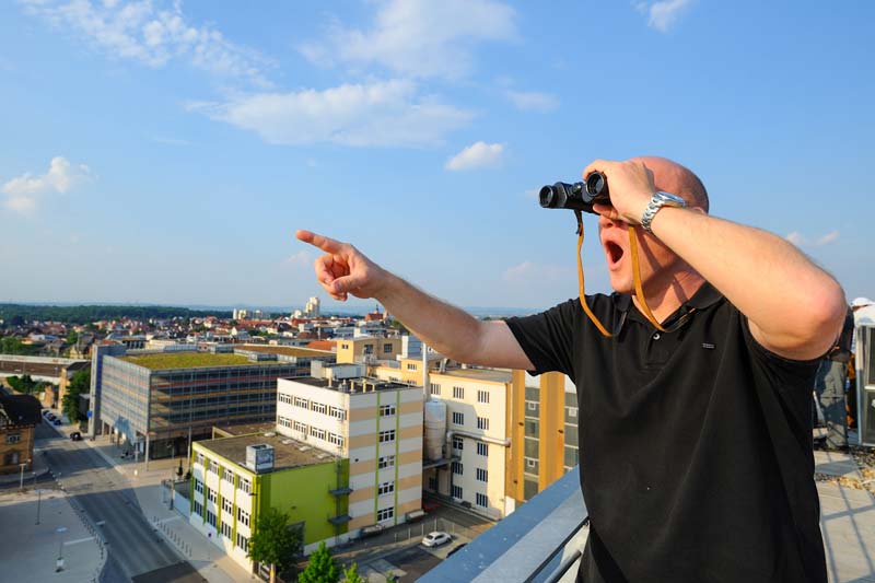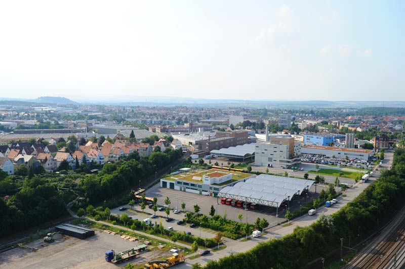 Die von Herrn Köninger geführte Tour startete mit einer grandiosen Aussicht vom Hochhaus der Wüstenrot. Danach genossen wir das Panorama vom Dach des neuen nh-Hotels neben der MHP Arena. Im Anschluss ging es hoch auf den Turm der Evangelischen Stadtkirche.