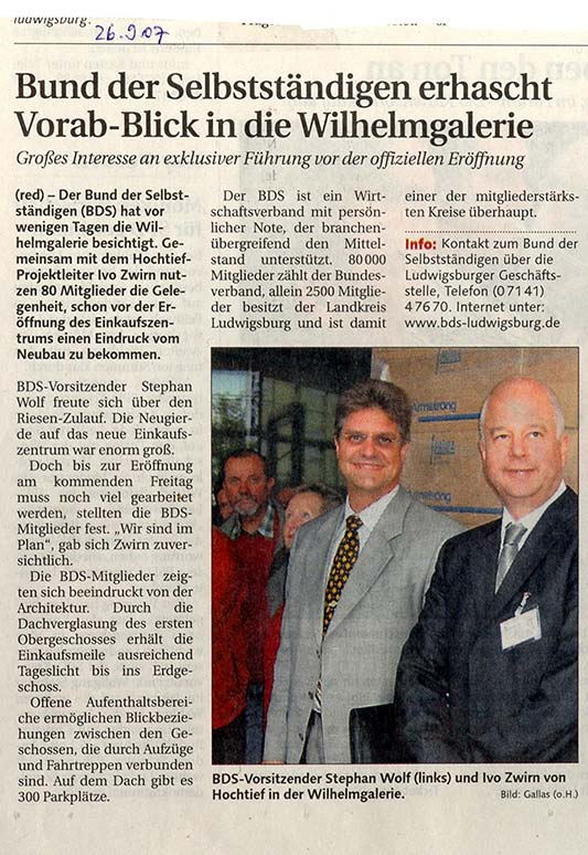 Es muss noch viel „gewerkelt“ werden im innerstädtischen Einkaufszentrum in der ehemaligen Reiterkaserne Wilhelm des Großen hinter den Fassaden von 1857 auf 40 000 Quadratmetern mit zwei Ebenen mit Einzelhandels-, Gastronomie- und Büroflächen: „Da isch ab'r no viel z'macha“, Originalzitat einer BDS-Veranstaltungsteilnehmerin, „des sen ja nur no zweiahalb Wocha bis z'r Eröffnong.“ Das Projektmanagement ist aber zuversichtlich: „Man sei im Plan“.